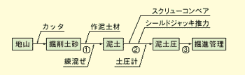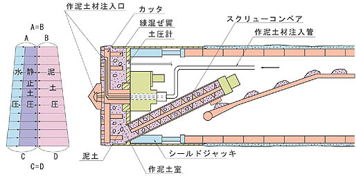 泥土を作泥土室とスクリューコンベア内に充満させ、シールドジャッキの推力により泥土圧を発生させ、この圧力で地下水圧と土圧に対抗し切羽の安定を図ります。 - 泥土圧により掘進管理します。